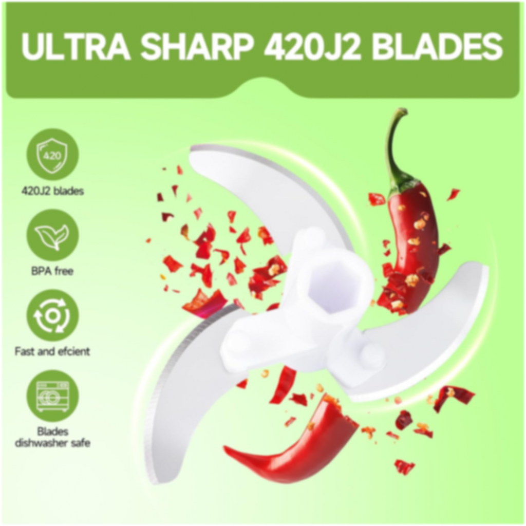 The chopper is made of BPA-Free and Non-Toxic material as a safe food tool. Easily clean and easily use. The chopper is designed with sharp stainless-steel blades for fast chopping, comfortable soft grid lid, anti-slip base and easy pulling cord and a large handle for effortless operation. Try it now and you will love it for sure.